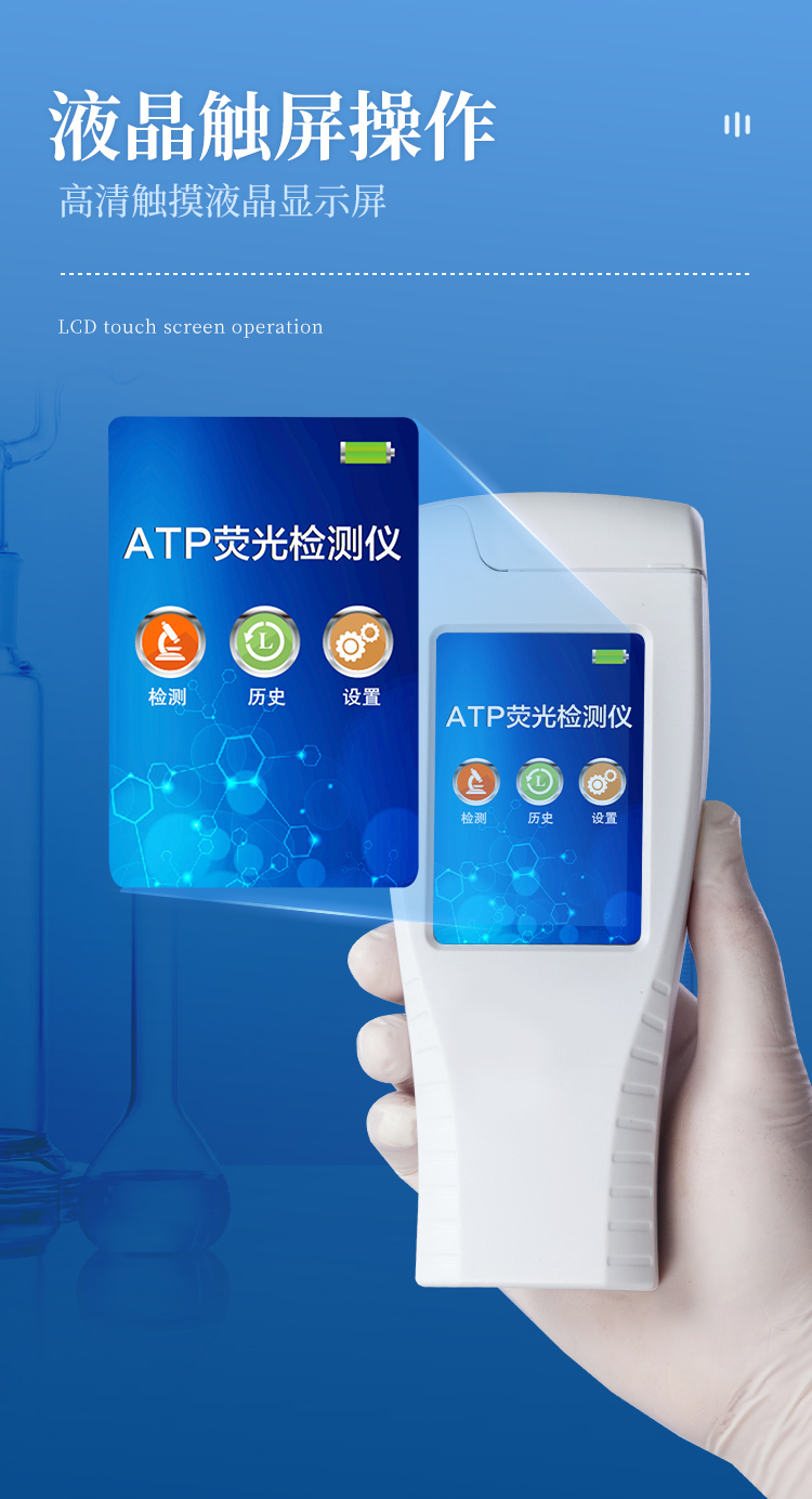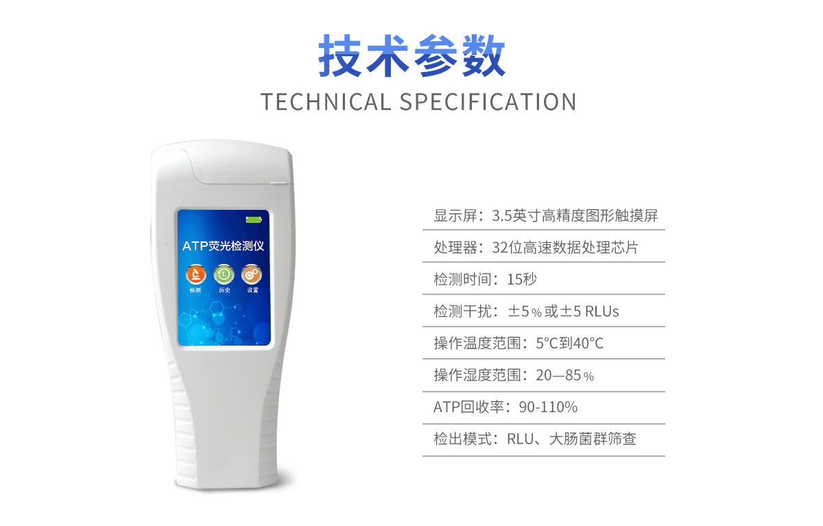 該設備采用生物化學反應方法檢測ATP含量,ATP熒光檢測儀基于螢火蟲發光原理,利用“熒光素酶—熒光素體系”快速檢測三磷酸腺苷(ATP)。ATP拭子含有可以裂解細胞膜的試劑,能將細胞內ATP釋放出來,與試劑中含有的特異性酶發生反應,產生光,再用熒光照度計檢測發光值,微生物的數量與發光值成正比,由于所有生物活細胞中含有恒量的ATP,所以ATP含量可以清晰地表明樣品中微生物與其他生物殘余的多少,用于判斷衛生狀況。