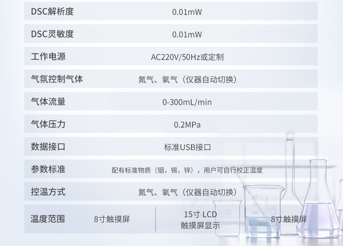 1.溫度范圍: -150~500℃ (根據(jù)制冷設(shè)備確定**溫度) 2.溫度分辨率: 0.01℃ 3.溫度波動(dòng): ±0.1℃ 4.溫度重復(fù)性: ±0.1℃ 5.升溫速率: 0.1~100℃/min 6.恒溫時(shí)間:建議<24h 7.控溫方式:升溫,恒溫(全自動(dòng)程序控制) 8.DSC量程: 0~±600mW 9.DSC解析度: 0.01mW 10.DSC靈敏度: 0.01mW 11.工作電源: AC220V/50Hz或定制 12.可選冷卻設(shè)備: - 壓縮空氣冷卻(-AR):RT ... 500℃ - 機(jī)械制冷(-MR): -40 ... 500℃ - 液氮制冷(-LN):-150 ... 500℃ (可以單獨(dú)或同時(shí)連接多種冷卻裝置) 13. 氣氛控制氣體:氮?dú)狻⒀鯕猓▋x器自動(dòng)切換) 14.氣體流量:0-300mL/min 15.氣體壓力:0.2MPa 16.顯示方式: 24bit色,8寸 LCD觸摸屏顯示 17.數(shù)據(jù)接口:標(biāo)準(zhǔn)USB接口 18.參數(shù)標(biāo)準(zhǔn): 配有標(biāo)準(zhǔn)物質(zhì)(銦,錫,鋅),用戶(hù)可自行校正溫度