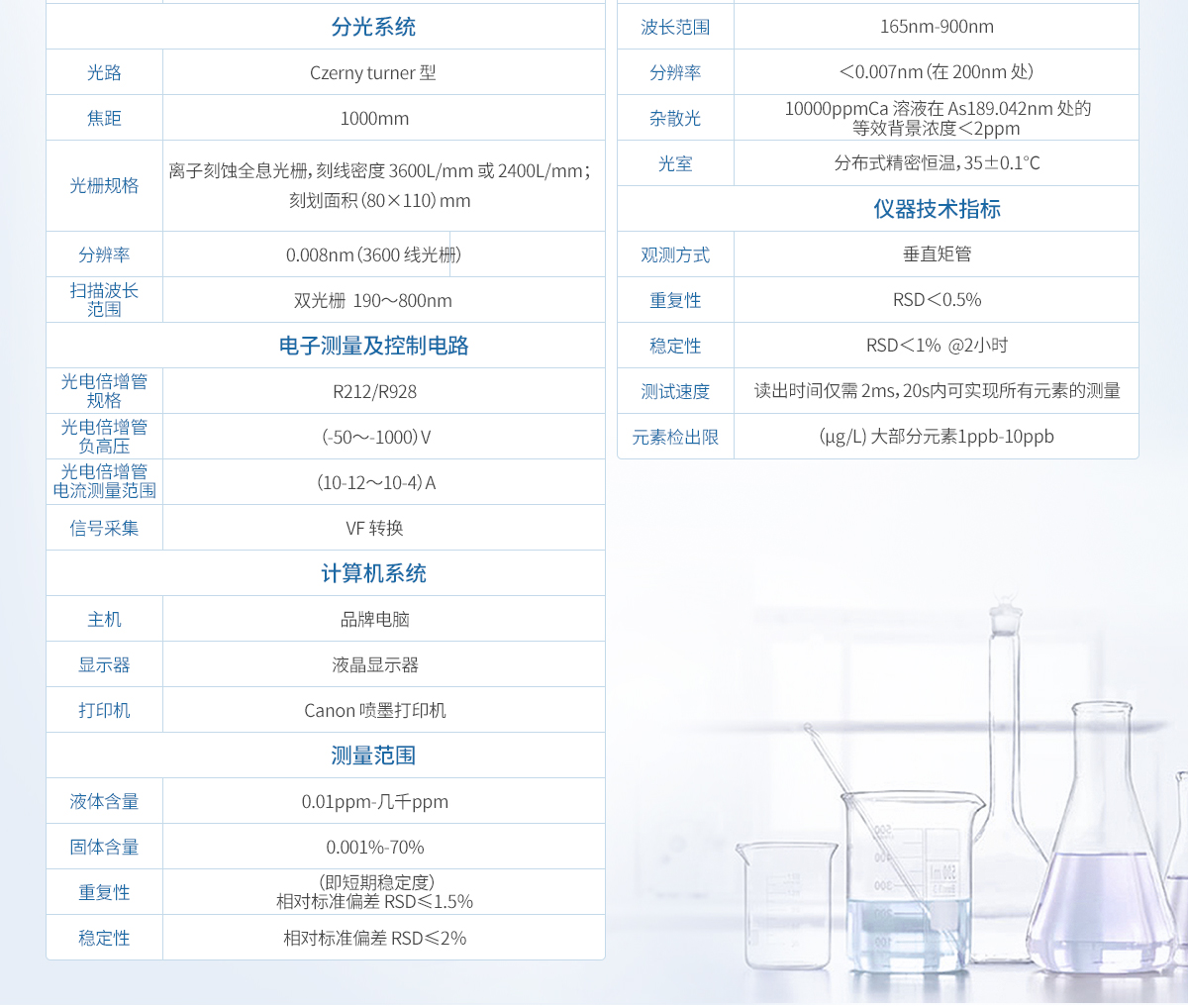 6、性能指標(biāo) 6.1 分析速度:≥每分鐘 50 個(gè)元素或譜線,而且每條測(cè)量譜線的積分時(shí)間≥10 秒; 6.2 樣品消耗量:<2ml,測(cè)定不少于 70 個(gè)元素; 6.3 譜線靈活性:可實(shí)現(xiàn)分析元素的定性、半定量和定量分析; 6.4 線性動(dòng)態(tài)范圍:≥106; 6.5 內(nèi)標(biāo)校正:內(nèi)標(biāo)校正功能,可實(shí)現(xiàn)內(nèi)標(biāo)元素和測(cè)量元素的同時(shí)曝光; 6.6 精密度:測(cè)定 1ppm 或 10ppm 多元素混合標(biāo)準(zhǔn)溶液,重復(fù)測(cè)定十次的 RSD≤0.5%; 6.7 穩(wěn)定性:測(cè)定 1ppm 或 10ppm 多元素混合標(biāo)準(zhǔn)溶液,長(zhǎng)時(shí)間穩(wěn)定性 RSD<1.0%; 6.8 檢出限:典型元素檢出限z低可達(dá) 0.1ug/L。