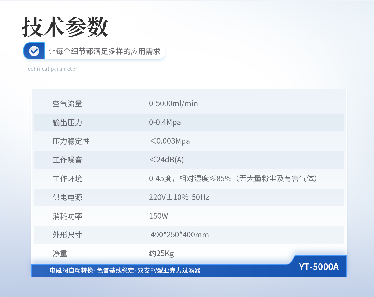 1、空氣流量: 0-5000ml/min 2、輸出壓力: 0-0.4Mpa 3、壓力穩定性:<0.003Mpa 4、工作噪音: <24dB(A) 5、工作環境: 0-45度,相對濕度≤85%(無大量粉塵及有害氣體) 6、供電電源: 220V±10% 50Hz 7、消耗功率: 150W 8、外形尺寸: 490*250*400mm 9、凈重: 約25Kg