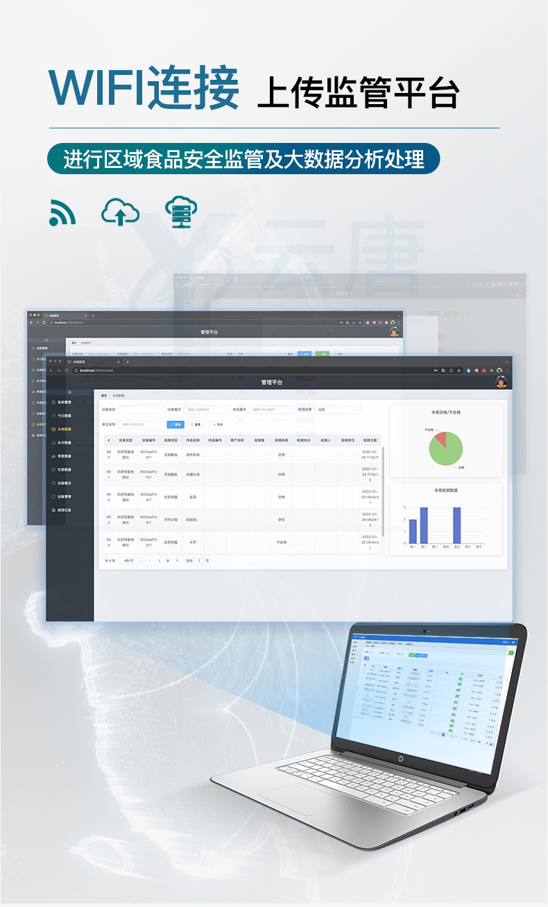 9.6、數(shù)據(jù)監(jiān)管系統(tǒng):同步對(duì)接監(jiān)管平臺(tái),數(shù)據(jù)可局域網(wǎng)和互聯(lián)網(wǎng)數(shù)據(jù)上傳,檢測(cè)結(jié)果可選擇直接傳至食品安全監(jiān)管平臺(tái)。進(jìn)行區(qū)域食品安全監(jiān)管及大數(shù)據(jù)分析處理與數(shù)據(jù)統(tǒng)計(jì),檢測(cè)區(qū)域食品安全長(zhǎng)短期動(dòng)態(tài),達(dá)到食品安全問(wèn)題預(yù)估、預(yù)警。