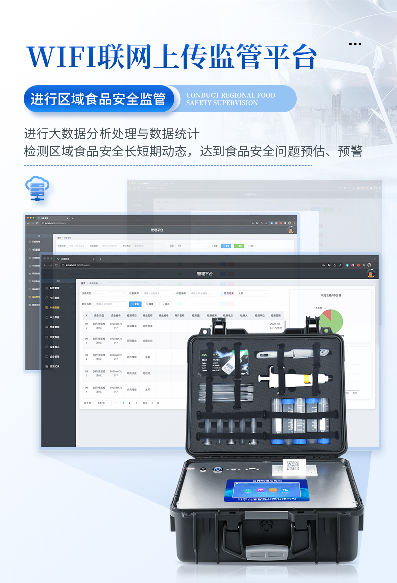 4、儀器帶有監管平臺,數據可局域網和互聯網數據上傳,檢測結果直接傳至食品安全監管平臺。進行區域食品安全監管及大數據分析處理與數據統計,檢測區域食品安全長短期動態,達到食品安全問題預估、預警