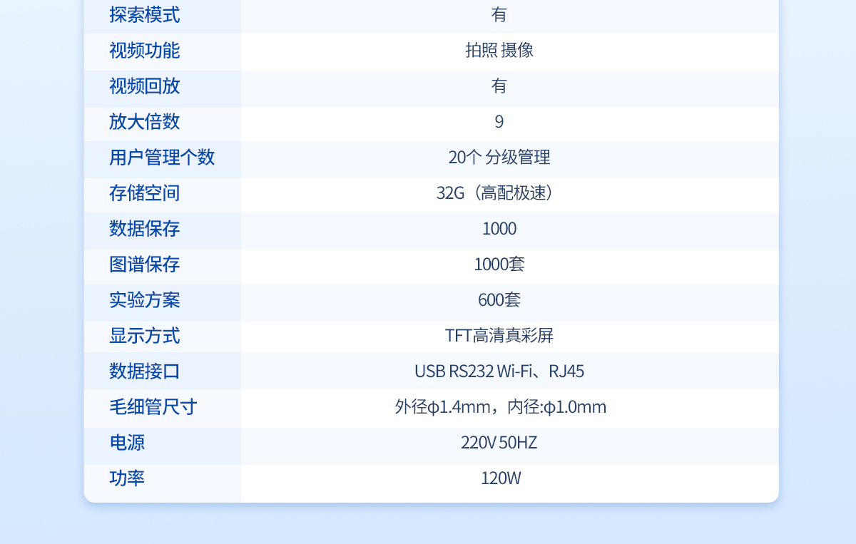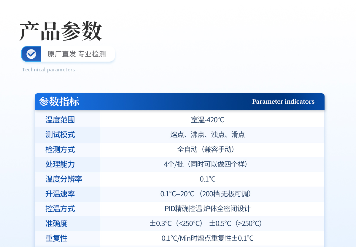 溫度范圍:室溫-400℃檢測方式:全自動(兼容手動)處理能力:4個/批(同時可以做四個樣)溫度分辨率:0.01℃升溫速率:0.1℃--20℃ (200檔 無極可調(diào))控溫方式:PID**控溫 爐體全密閉設(shè)計加熱方式:電熱塊空氣加熱法升溫分辨率:≤0.1℃升溫速率::0.1℃/Min--20℃/Min準確度:±0.2℃(<200℃)、±0.4℃(>200℃)重復(fù)性:0.1℃/Min時熔點重復(fù)性±0.1℃校正功能:具備探索模式:有視頻功能:拍照 攝像視頻回放:有/有時間水印高清攝像頭:觀察樣品熔融狀態(tài)放大倍數(shù):≥20用戶管理個數(shù):500個以上 分多級管理存儲空間:64G硬盤,≥2G內(nèi)存試驗方法:有數(shù)據(jù)保存:有圖譜保存:300套視頻保存:有內(nèi)存擴展:可以實驗方案:500套審計追蹤:有顯示方式:不小于8寸高清彩屏數(shù)據(jù)接口:數(shù)據(jù)接口:USB,網(wǎng)絡(luò)WiFi接口,RS232數(shù)據(jù)真實性:防篡改功能數(shù)據(jù)導(dǎo)出:可用U盤導(dǎo)出數(shù)據(jù)輸出形式:PDF格式和EXCL數(shù)據(jù)數(shù)據(jù)溢出提醒:提前自動提醒打印機:選配毛細管尺寸:外徑φ1.4mm,內(nèi)徑:φ1.0mm電源:220V 50HZ  功率:120W