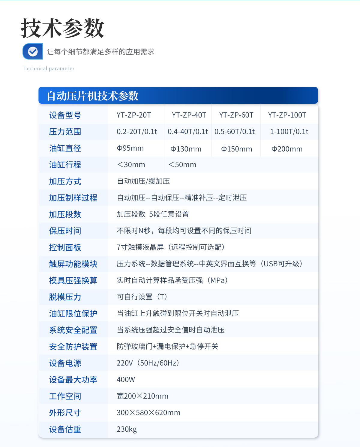 | 設備型號:YT-SP-30TB | 壓力范圍:0-30T/31.5MPa | 壓力換算:1MPa=0.95t/1t=1.05MPa | 活塞直徑 :Ф110mm | **活塞行程:<40mm> | 壓力表類型:壓力、壓強雙刻度顯示,顯示精度1MPa | 加泄壓方式:手動加壓/緩加壓,手動泄壓 | 壓力穩定性:≤1MPa/10min | 工作臺直徑:Φ120mm | 工作空間 :寬92×160mm | 外形尺寸 :275×210×470mm | 設備重量 :約58kg | 配置說明:壓片機1臺,模具選配,可根據需求定制壓片機或模具 |