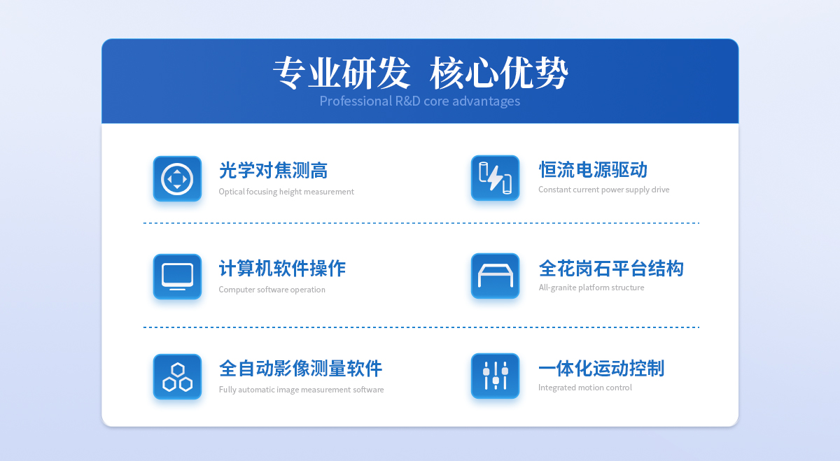 | 1. 采用HKVISION千兆網數字相機及手動卡位變焦物鏡作為測量瞄準系統; | 2. 由移動工作臺、三軸電子光柵尺和運動專用控制盒組成數據傳動控制系統; | 3. 采用雙重閉循環運動控制,保證電機在高速運動時**的定位性能; | 4. 采用本公司開發的嵌入式模塊控制機電,提高了電機回應速度,同時簡化儀器與PC的界面,; | 5. 采用全花崗石平臺結構,外觀簡潔大方,永不變形,永不生銹; | 6. 表面光由四環八區環形LED光源組成,每一組均為恒流電源驅動,并按需要分區程序顯示; | 7. Z軸影像對焦直接通過計算機軟件操作,無需手動調焦,大幅度提高工作效率; | 8. 具有多種數據處理、顯示、輸入、輸出功能,使測量與辦公完全結合在一起; | 9. 與計算機連接后,采用全自動影像測量儀專用軟件測繪圖形進行處理及輸出; |