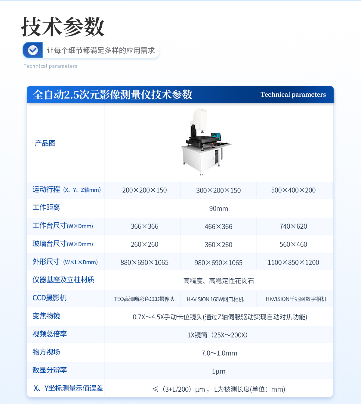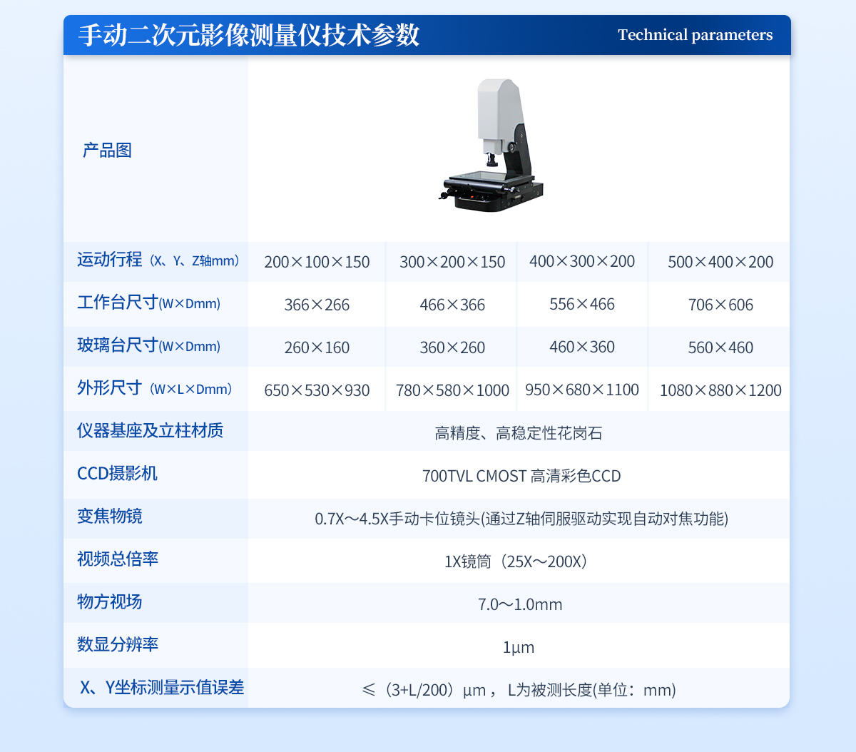 | 1. 運動行程(X、Y、Z軸mm):500×400×200 | 2. 工作距離:90mm | 3. 工作臺呎寸(W×Dmm):740×620 | 4. 玻璃臺呎寸(W×Dmm):560×460 | 5. 外形尺寸(W×L×Dmm):1100×850×1200 | 6. 儀器基座及立柱材質:高精度、高穩定性花崗石 | 7. TBI精密滾珠絲桿+西德精密無牙傳動+精密P級直線導軌構成XYZ優質傳動系統 | 8. CCD攝影機:HKVISION千兆網數字相機 | 9. 變焦物鏡: 0.7X~4.5X手動卡位鏡頭(通過Z軸伺服驅動實現自動對焦功能) | 10. 視頻總倍率: 1X鏡筒(25X~200X) | 11. 物方視場: 7.0~1.0mm | 12. 數顯分辨率:1μm | 13. X、Y坐標測量示值誤差≤(3+L/200)μm , L為被測長度(單位:mm) | 14. 操作方式:XYZ三軸全自動伺服電機控制 +集成一體化運動控制設計 (只需對接220V電源界面、USB界面、AV視頻界面即可使用) | 15. 測量軟件:INS全自動影像儀專用測量軟件 | 16. 工作環境:溫度20±5 ℃,濕度35%-75%(盡量滿足環境條件),如果溫濕度條件不能達到以上標準,至少要將儀器放置在少灰塵,少油氣,遠離振動源的室內。 |