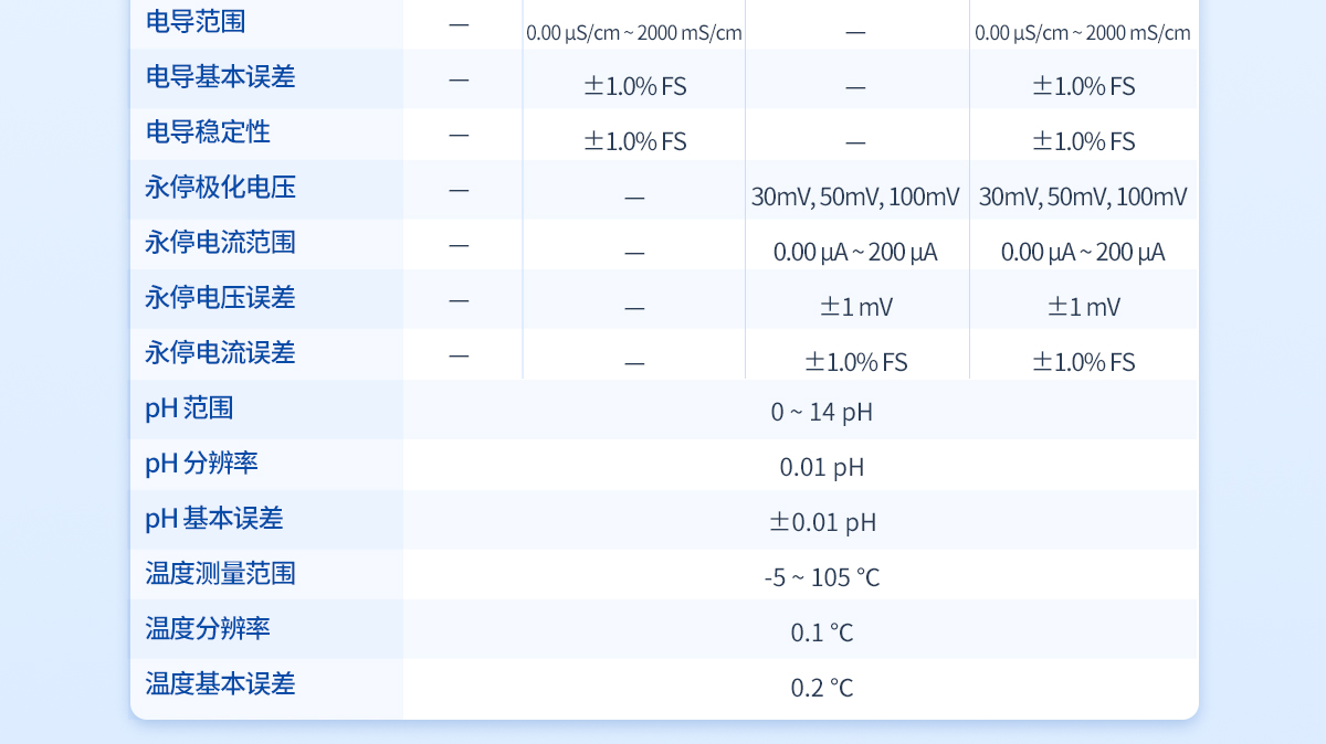 | 滴定分析重復性:≤0.2% | 滴定分析誤差:≤1.5% | 10mL滴定管滴定容量精度:±5μL | 20mL滴定管滴定容量精度:±10μL | 10mL滴定管滴定容量誤差:10μL/10mL | 20mL滴定管滴定容量誤差:20μL/10mL | 電位范圍:-2000—2000mV | 電位分辨率:0.1mV | 電位基本誤差mV:±0.25‰/FS | 電位穩定性mV:±0.3mV/3h | pH范圍:0-14PH | pH分辨率:0.01PH | 溫度測量范圍:-5 - 105℃ | 溫度分辨率:0.1℃ | 溫度基本誤差:0.2℃ |